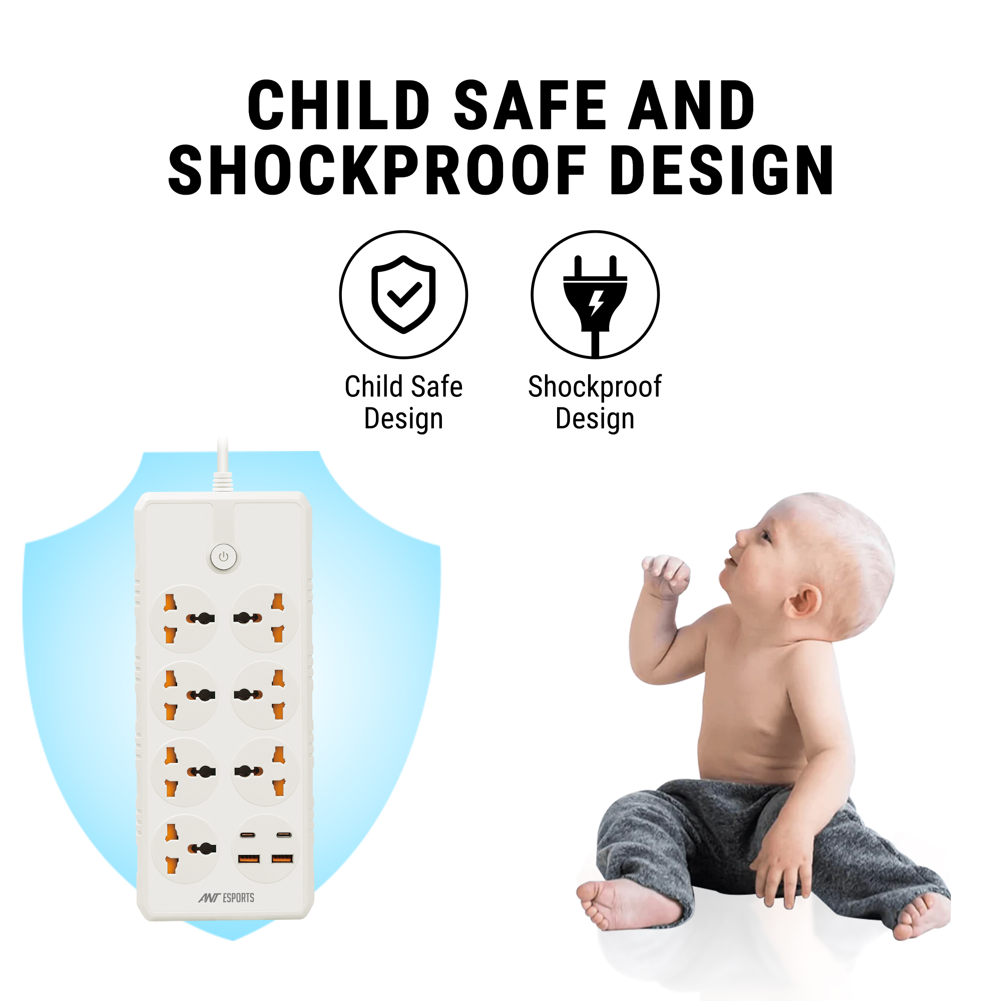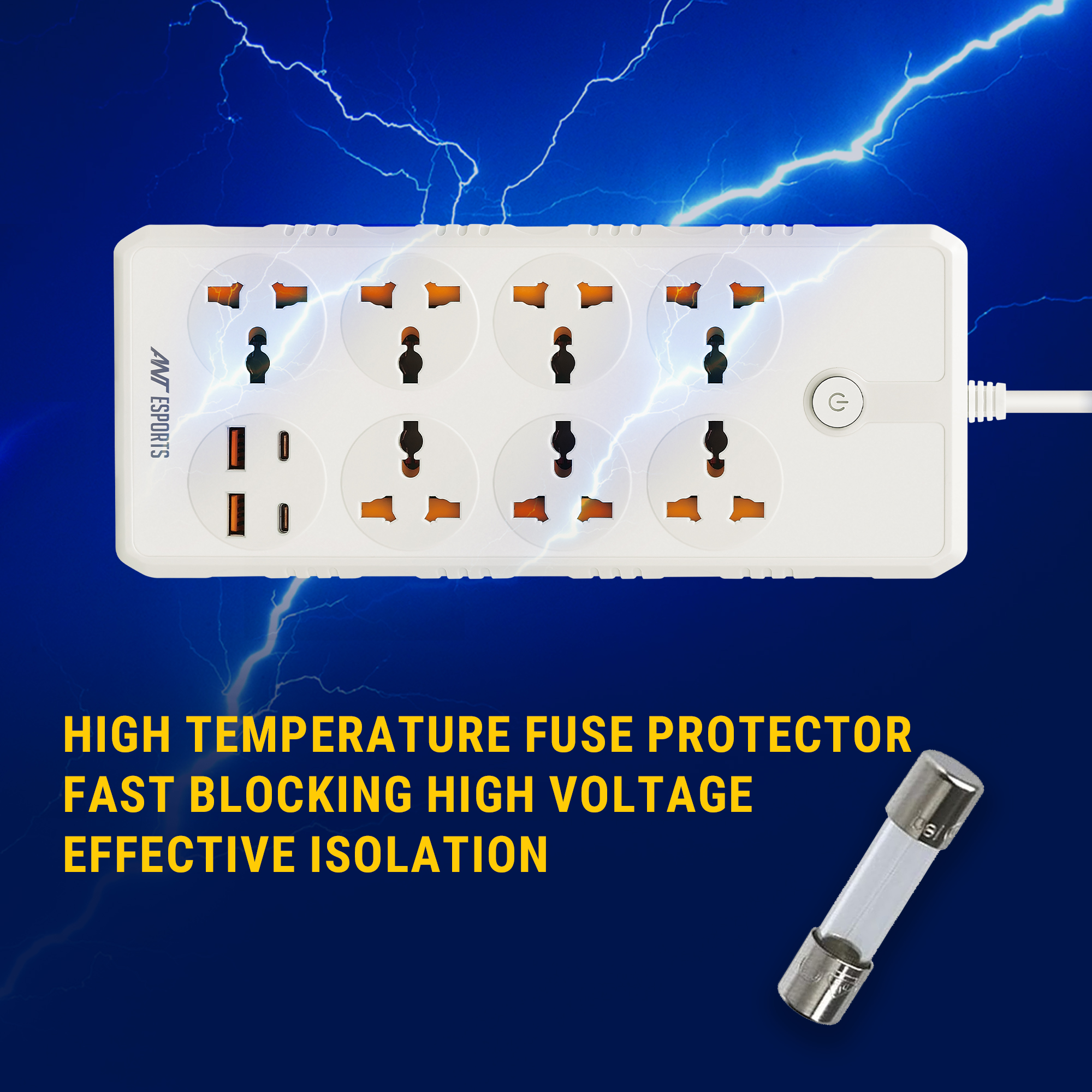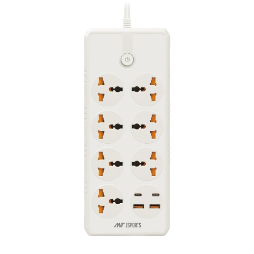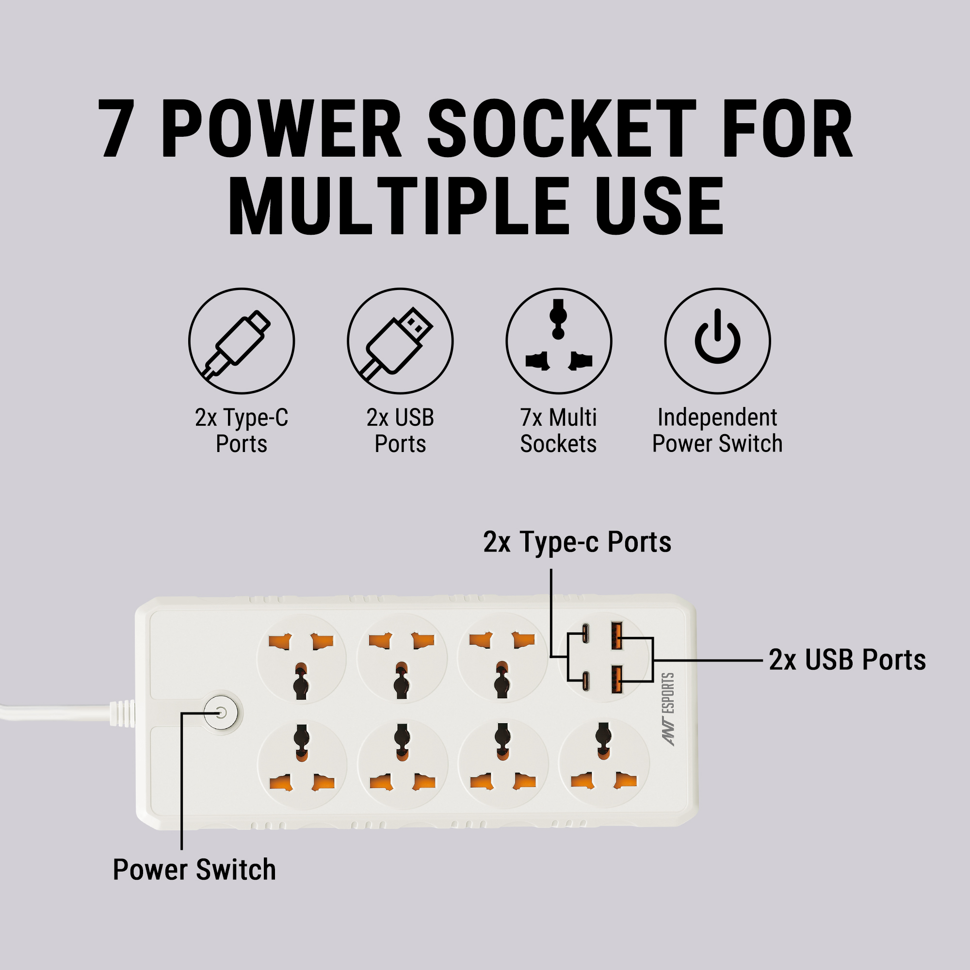 Step into the world of advanced power solutions with the Ant Esports PS722 Power Strip. This versatile power strip is designed to meet all your electrical needs, featuring seven three-pin power connectors along with two USB Type-A ports and two USB Type-C ports, ensuring you can conveniently charge your devices alongside powering your appliances.With a robust total power draw of 2500W, the PS722 is suitable for heavy electrical appliances such as AC units, refrigerators, TVs, and more. Safety is paramount, and this power strip incorporates overheat protection, overvoltage protection, overcurrent protection, and short circuit protection. Its child safety design includes covered plugs, making it a secure choice for households with young ones.