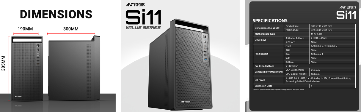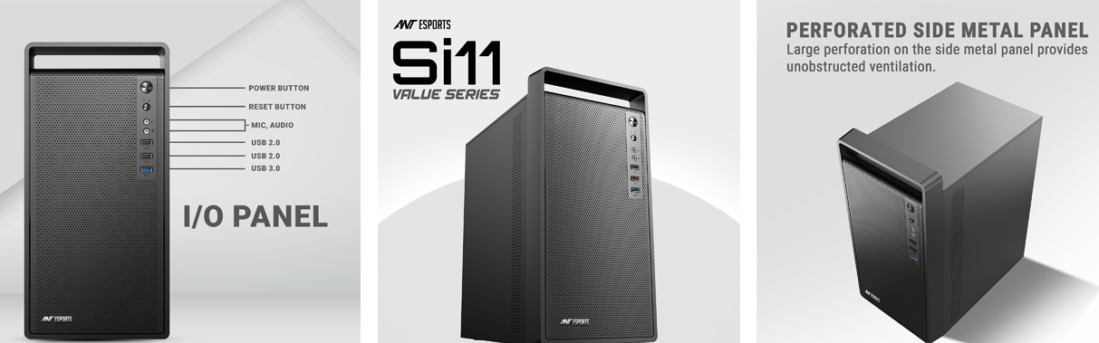 The Ant Esports Si11 is the perfect blend of professionalism and gaming prowess for office and professional environments. This cabinet is thoughtfully designed to cater to the needs of the modern workspace, featuring a complete opaque side panel with precision-perforated airflow for direct cooling to the CPU. The front mesh panel ensures the intake of fresh air, contributing to a cool and efficient system.With a top handle for easy mobility, the Si11 offers convenience for professionals on the go. Tailored for versatility, this case accommodates CPU air coolers of up to 160mm in height, mATX motherboards, and supports simultaneous installation of two 3.5" HDDs and four 2.5" SSDs. The IO panel includes two USB 2.0 ports, a single USB 3.0 port, standard buttons, and audio ports for seamless connectivity.