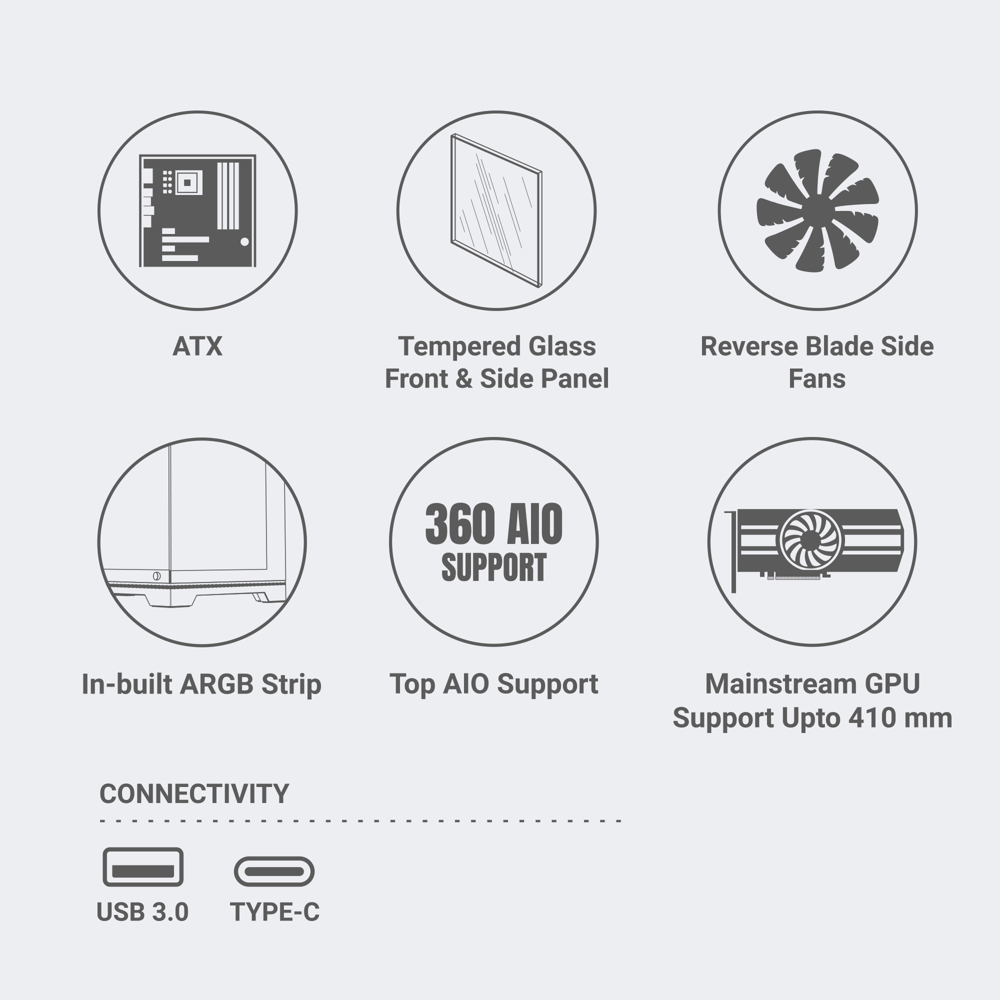 | Pre-Installed Fans | x 3 Side Fans (Reverse Blade), x 1 Rear Fan x 3 Bottom Fans | |