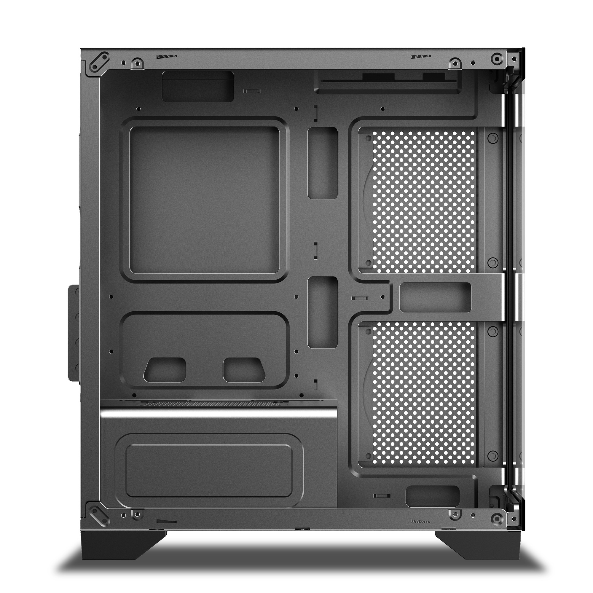 The side tempered glass and Half-Length PSU shroud allows for two side-mounted additional FANs and a clear view inside.