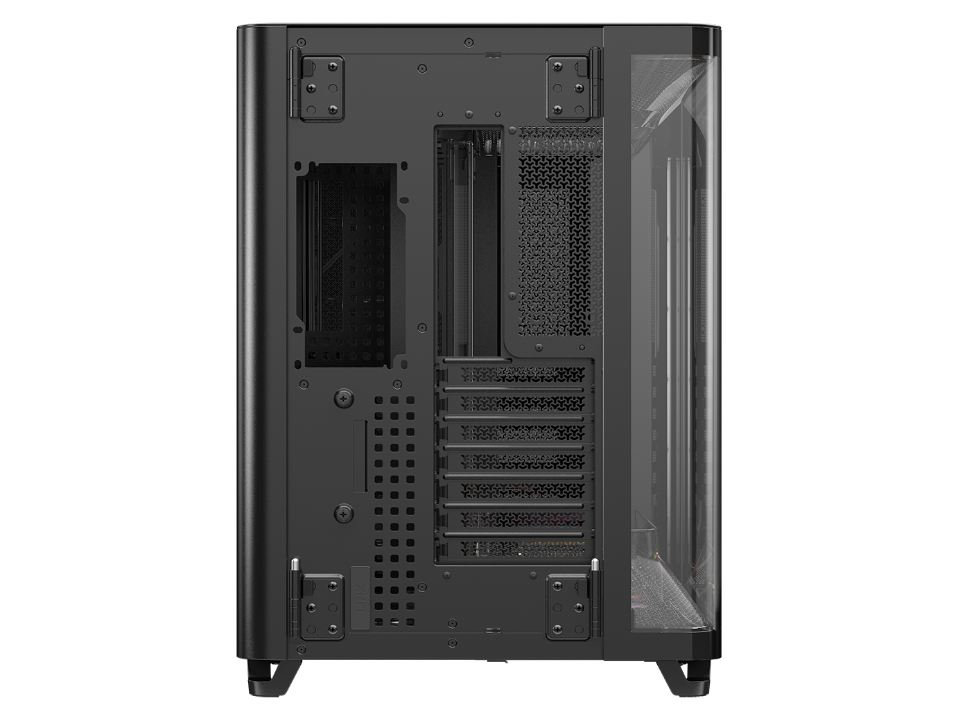 Two glass panels connect in the corner of the chassis and open outwards with hinges that disappear for a seamless look and easy access to your hardware.