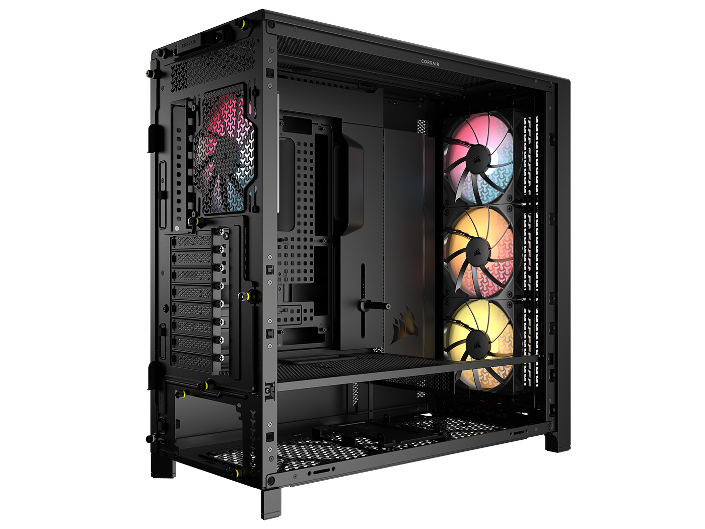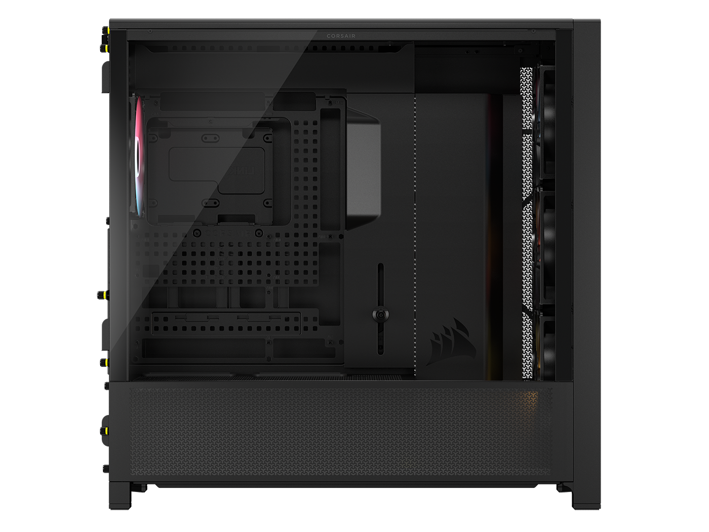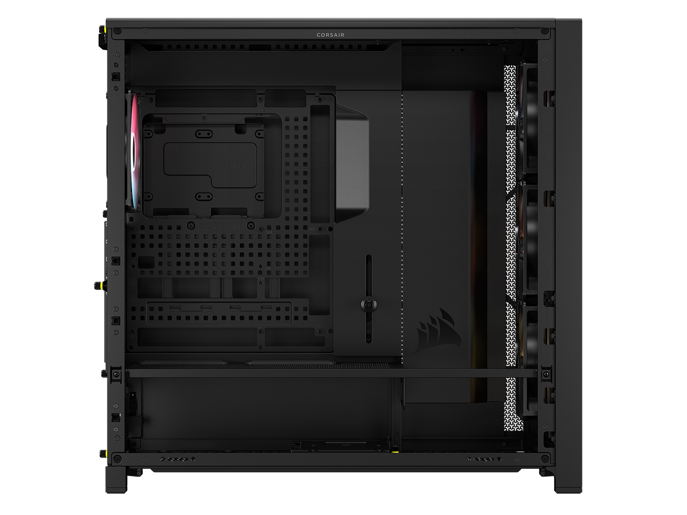 The CORSAIR FRAME 5000D is a fully-modular high-airflow and customizable spacious mid-tower PC case featuring InfiniRail™ Fan Mounting System and compatible with reverse connector motherboards.