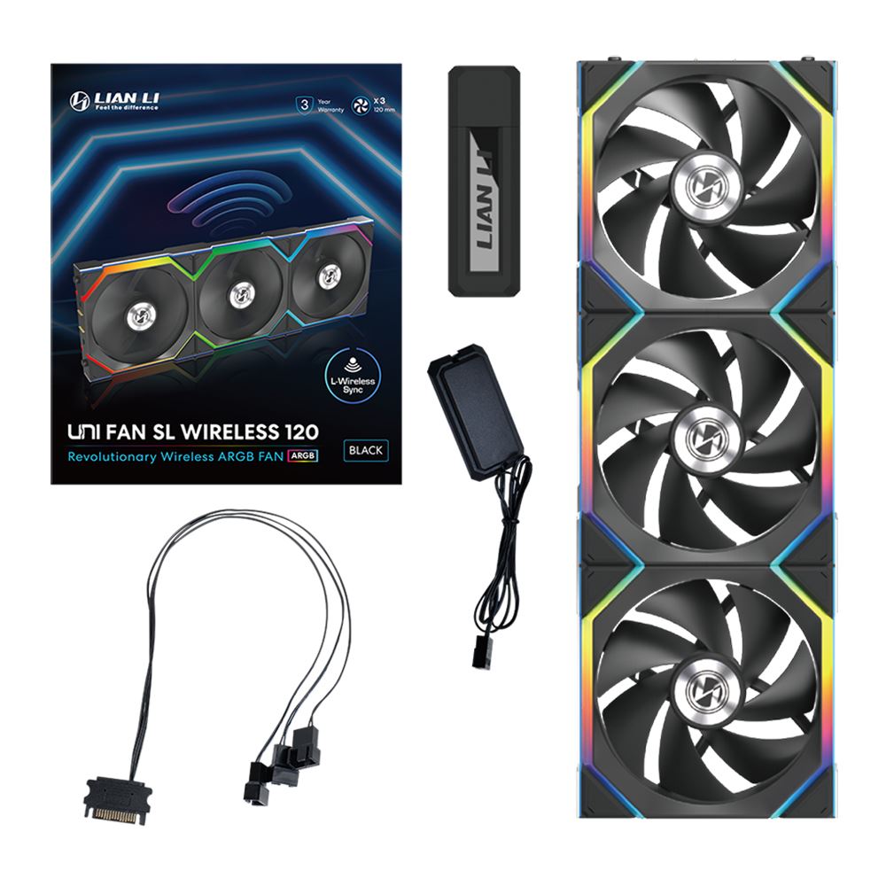 Based on user experience and continuous research, we newly designed a L-Wireless controller. The L-Wireless controller connects to the motherboard, and transmits a 2.4GHz signal to the fan, enabling the wireless control of the LED lighting effects and fan speed for the UNI FAN SL Wireless Series.