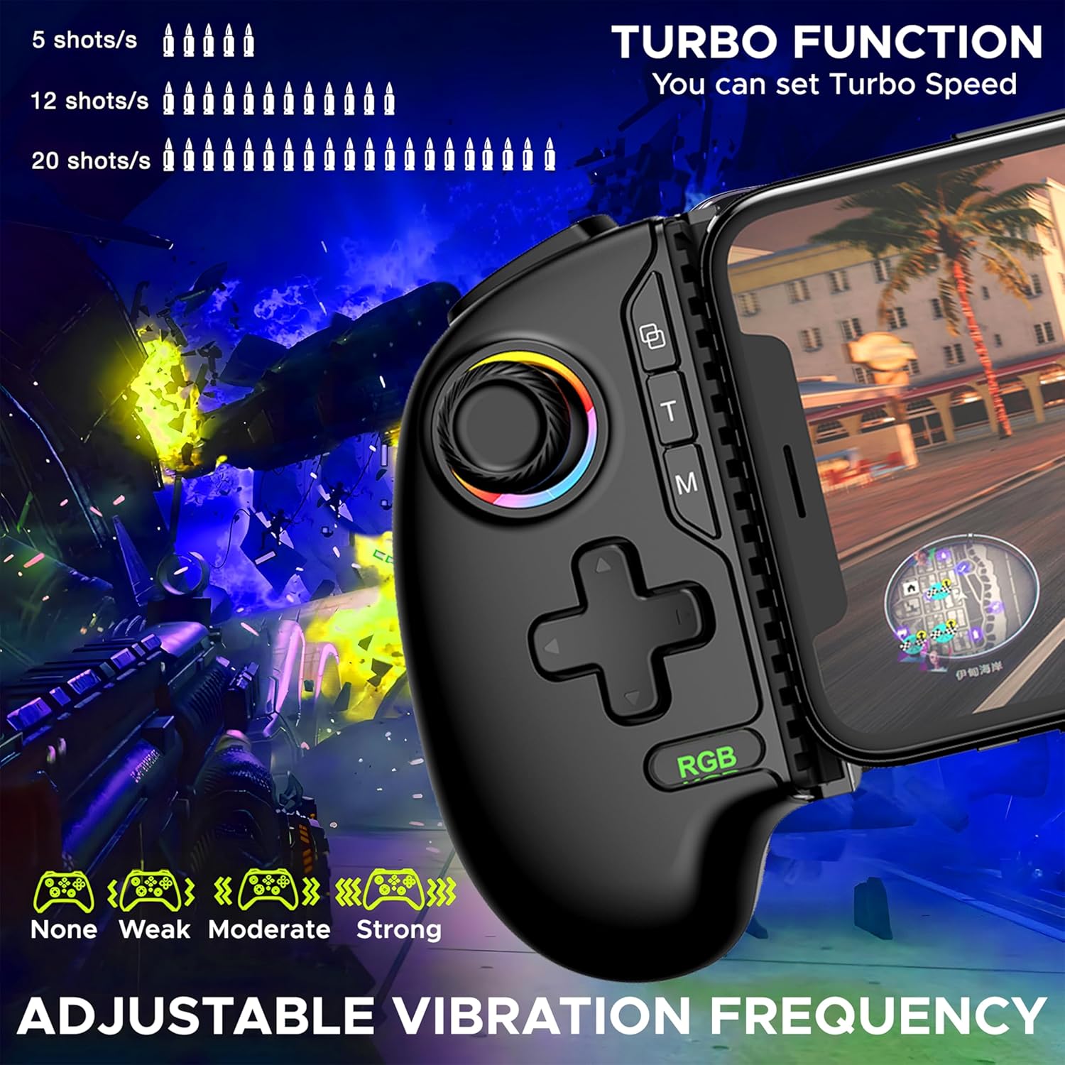 Ergonomic Fit for All Phones: Designed for 4–7 inch devices, no case removal needed. Enjoy extended play with 6+ hours battery life, adjustable turbo function & comfortable grip for marathon gaming.