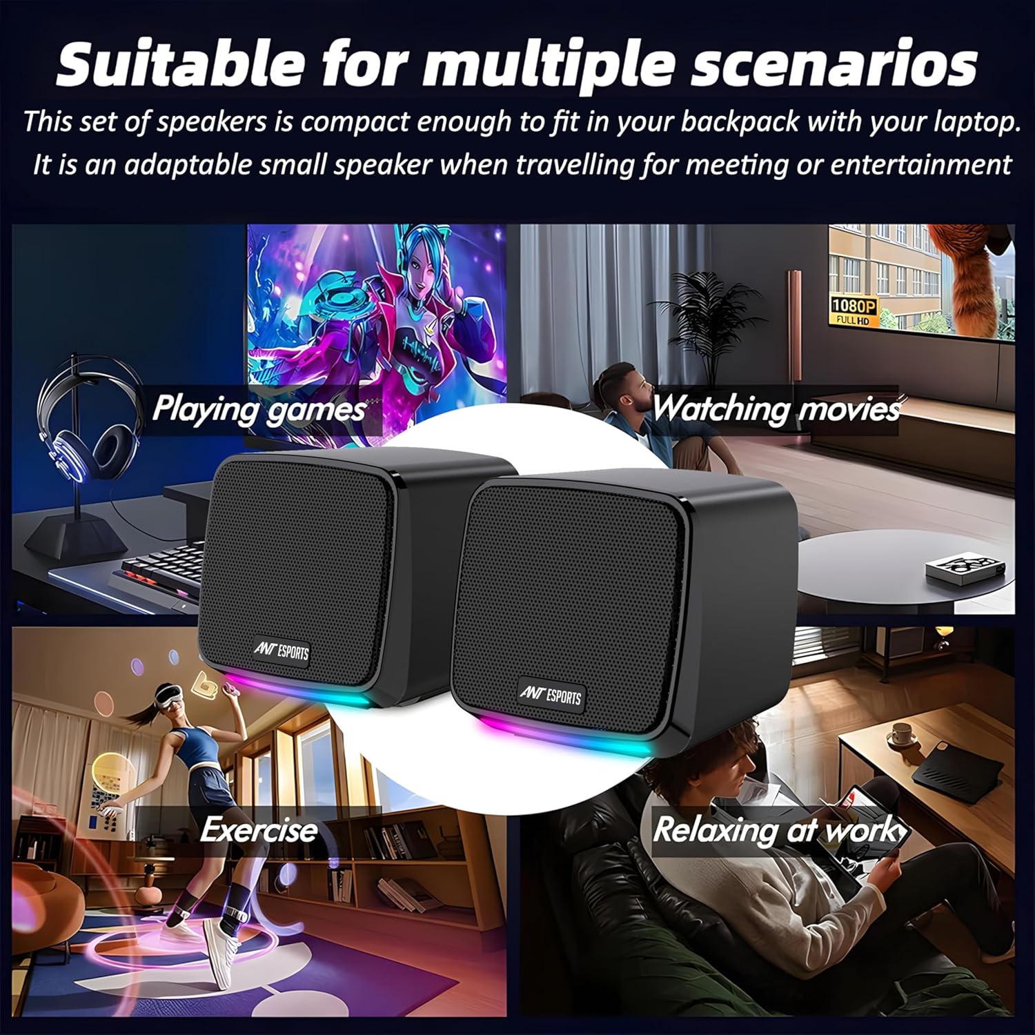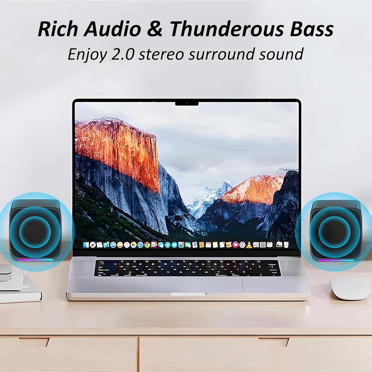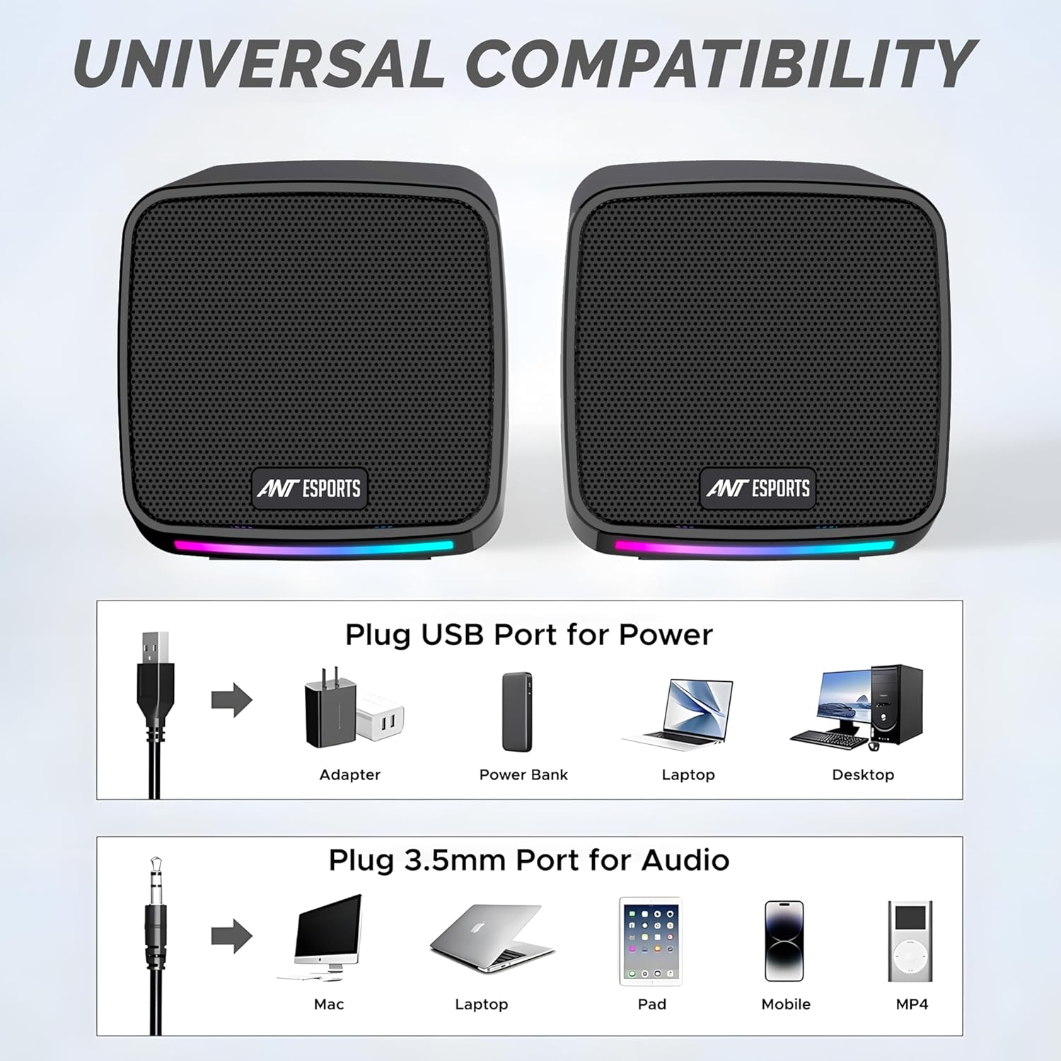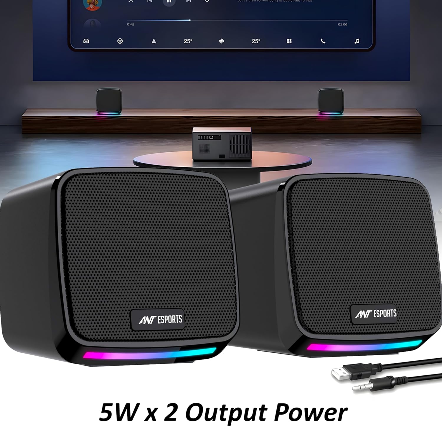 Dynamic RGB Lighting Effects -Features 7 single-color cool breathing lights on RGB Desktop Speakers, creating a vibrant gaming atmosphere for enhanced immersion during play or work.